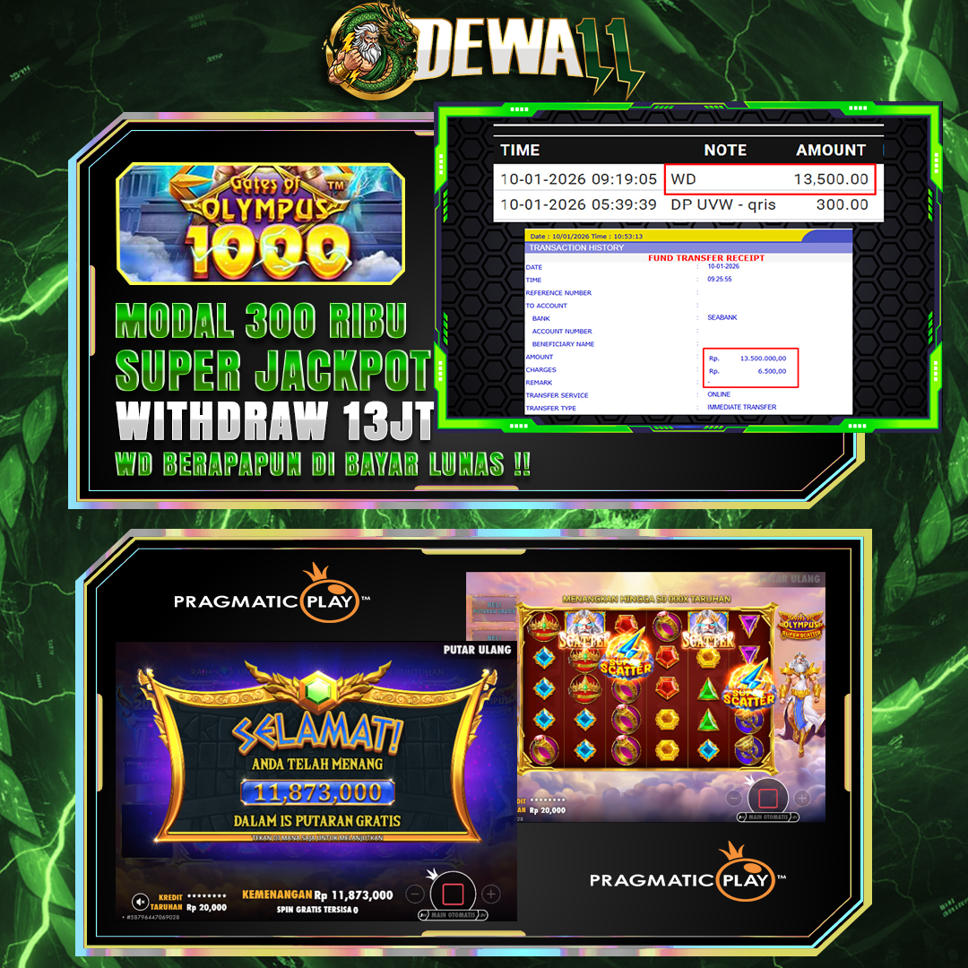 Gabung bersama DEWA11 dan Dapatkan kesempatan jackpot sensasional dalam 15 menit seperti bukti banner ini bukan sekedar janji hanya Depo 300k Withdraw 13,5 juta hari ini.